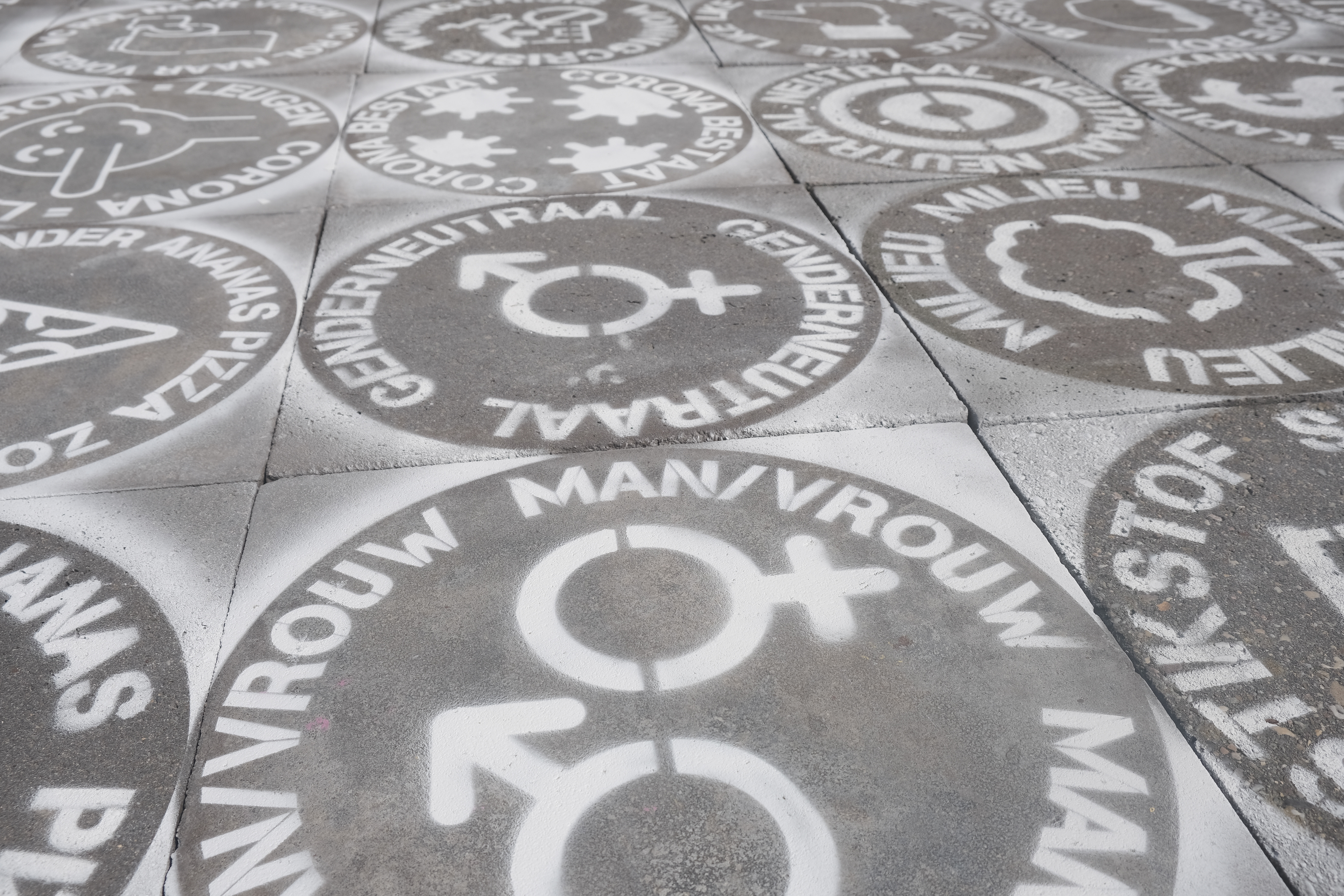 This game is mobile and can be set up in any public area. The topics are laser-cut into templates and applied to the ground using chalk spray. Over time, the game naturally fades due to both playing and weather.